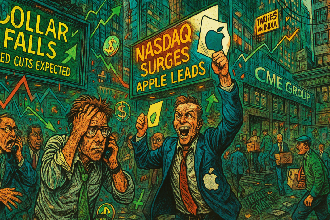 Nesta quinta-feira, o mercado global apresenta um claro posicionamento otimista. O dólar perdeu terreno, apoiado por expectativas de cortes monetários, enquanto os mercados acionários respondem favoravelmente, especialmente em tecnologia. No entanto, a escalada de tensões comerciais, com tarifas adicionais sobre a Índia, e mudanças institucionais na CME Group sinalizam que os participantes continuam ajustando portfólios com cautela.